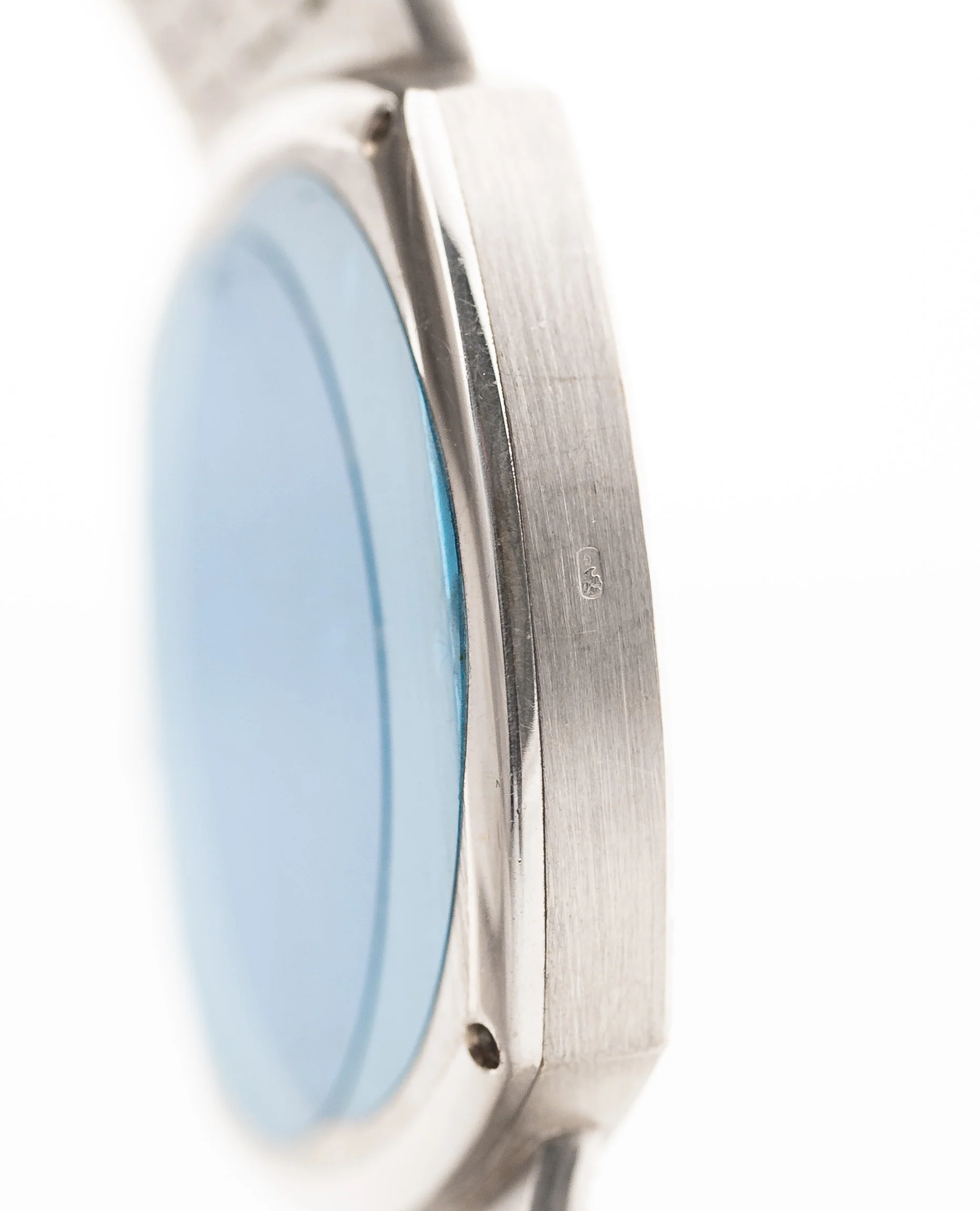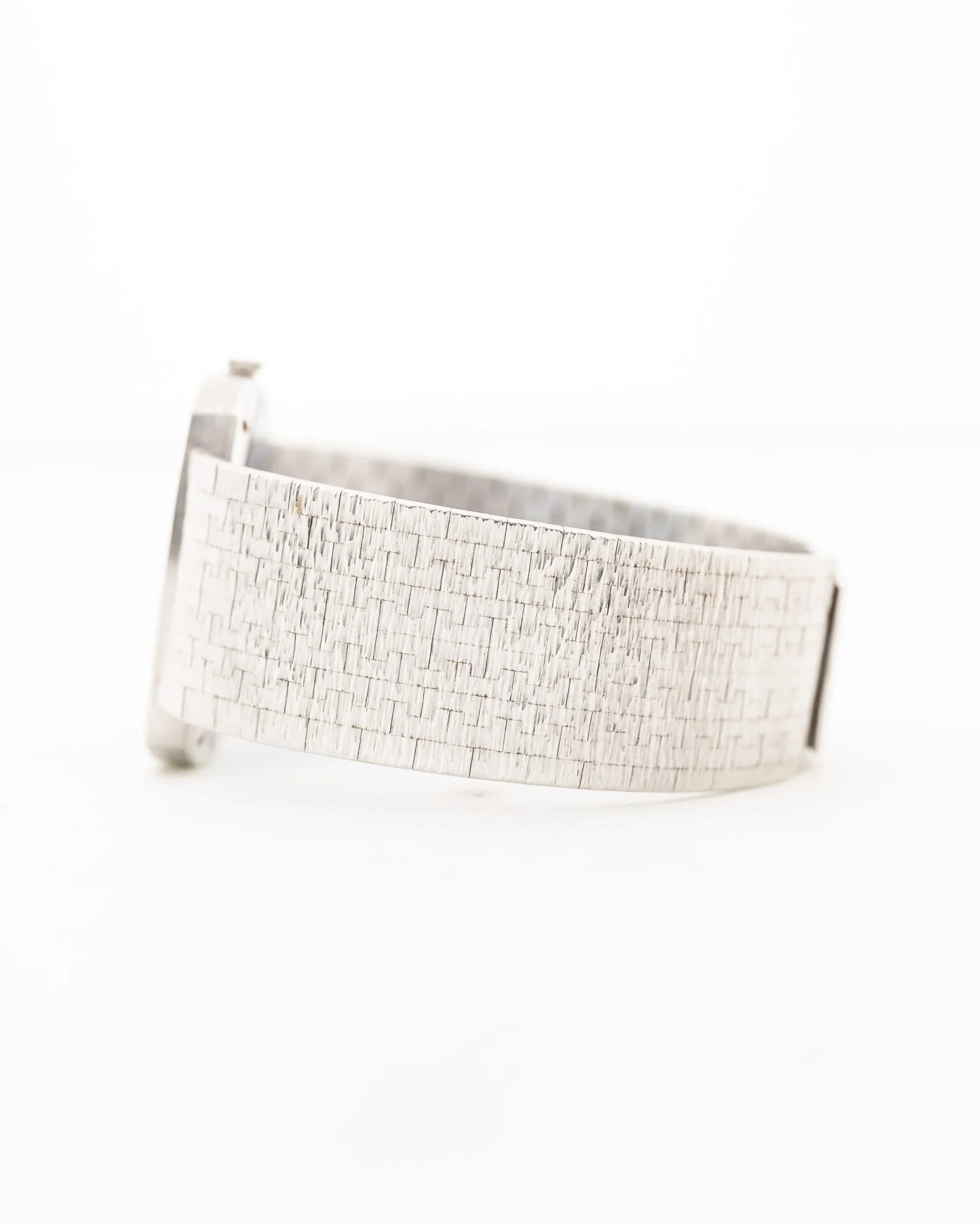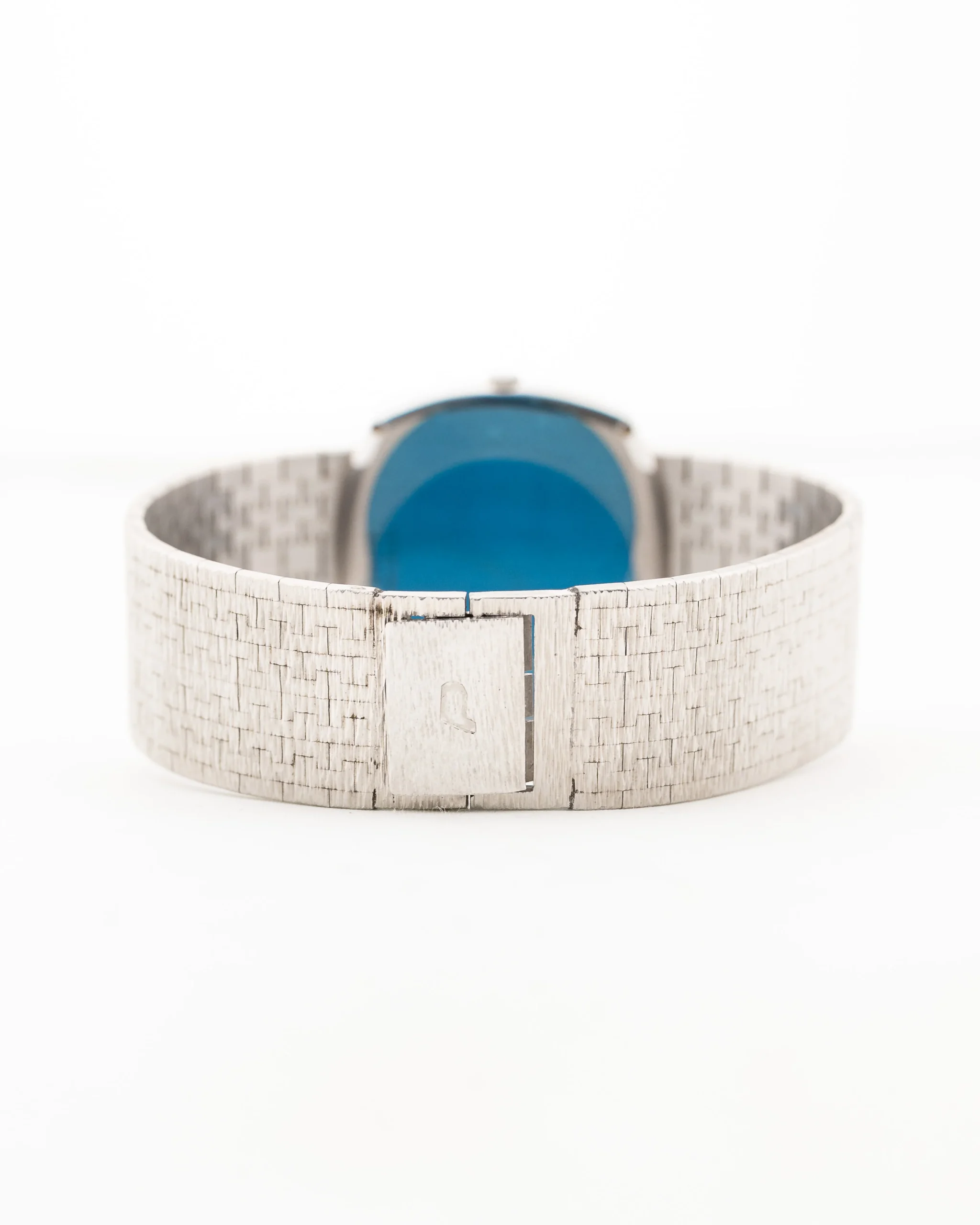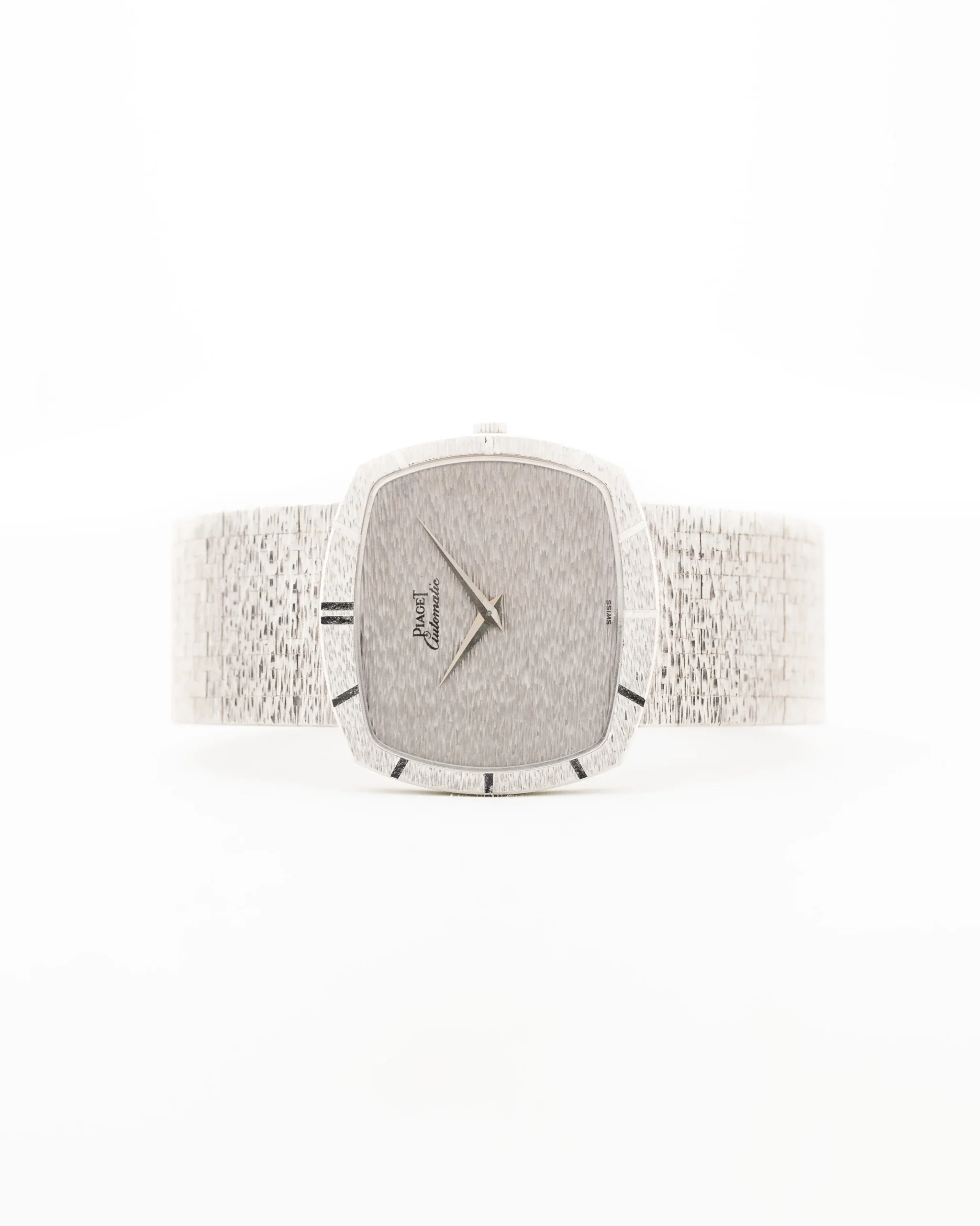 Nuestra pieza se presenta en un fantástico estado casi sin estrenar, con un impresionante brazalete Piaget integrado de oro blanco de 18 quilates, la esfera de oro blanco está en perfecto estado y la forma de caja de TV con los índices en el bisel es una auténtica obra de arte única.