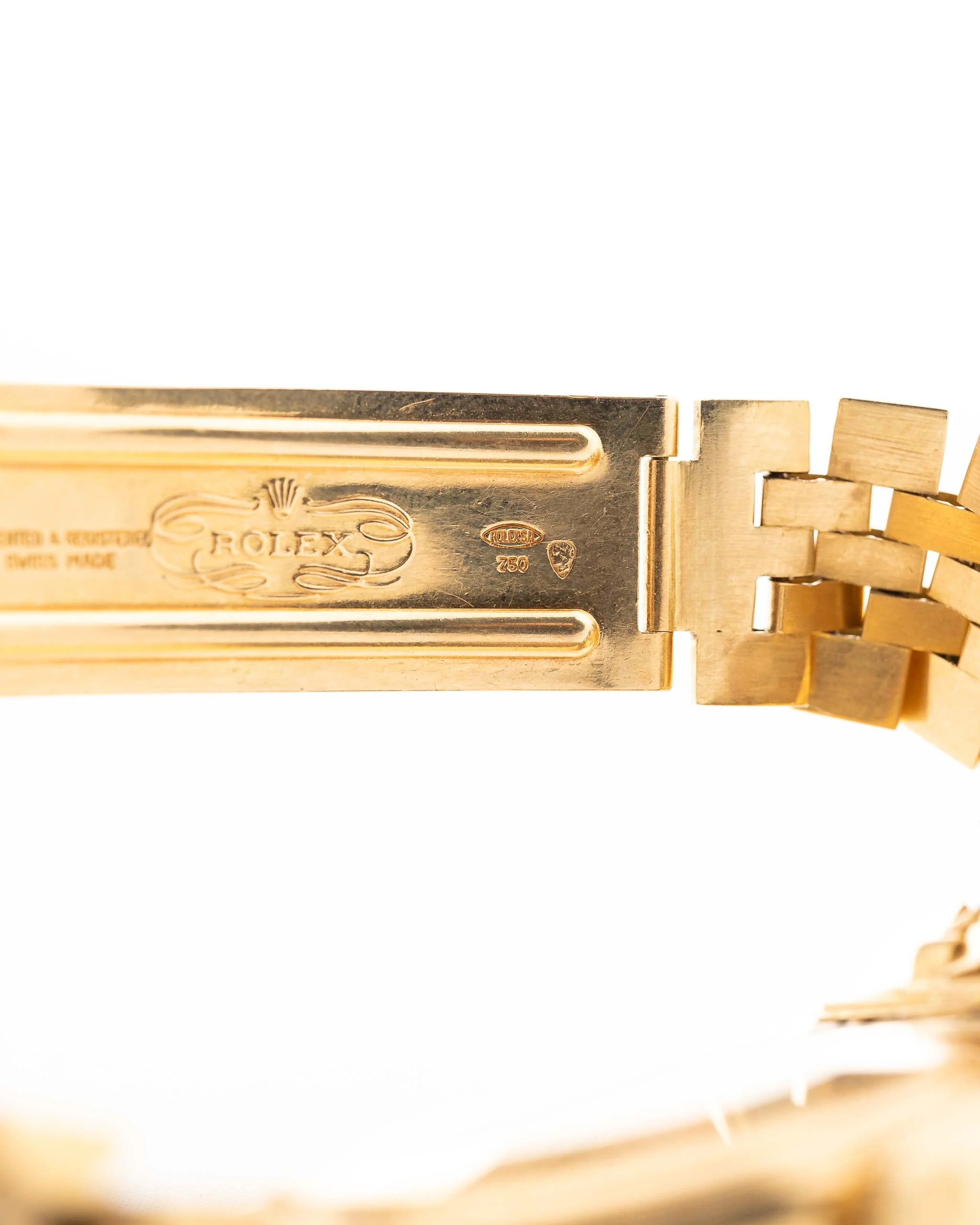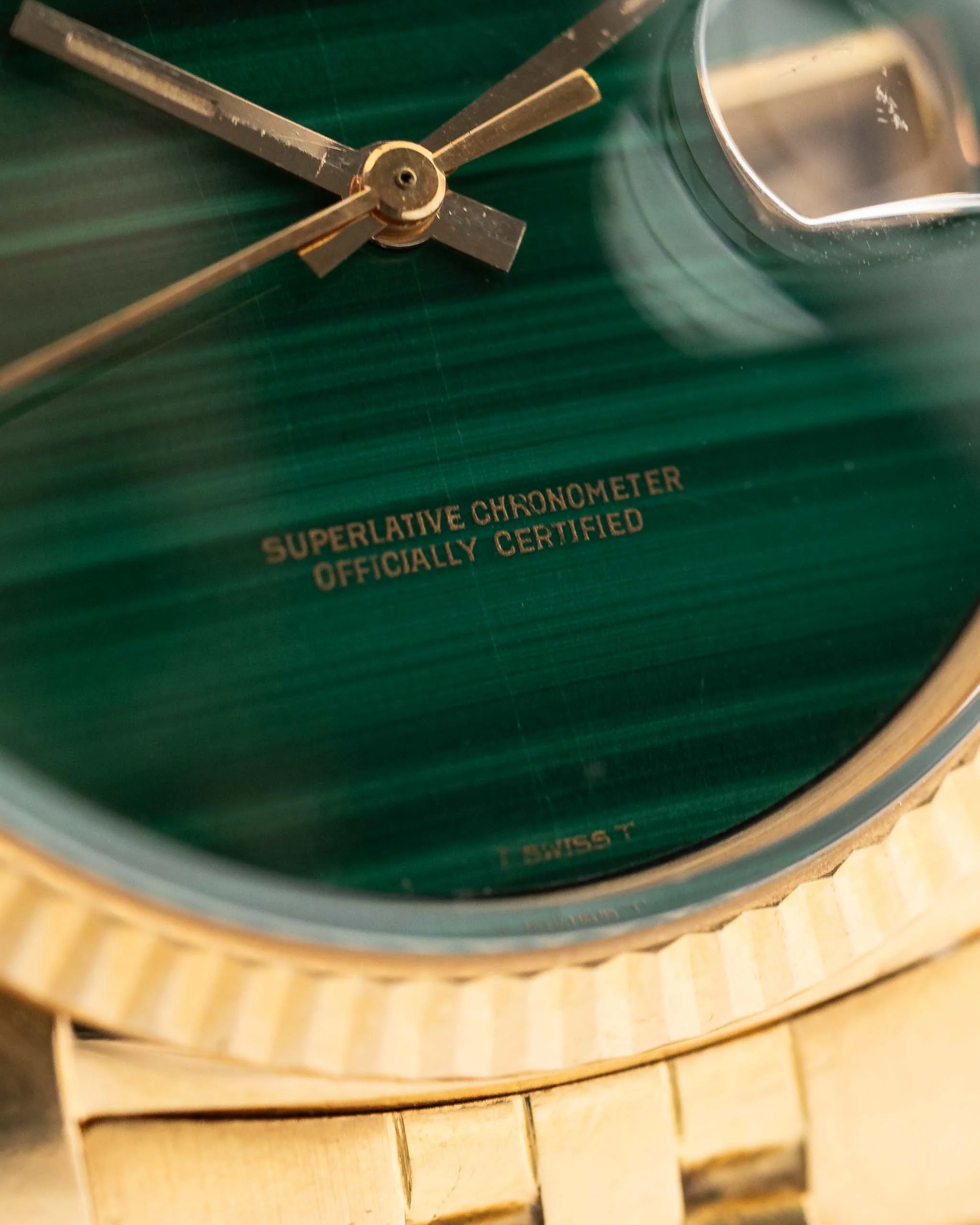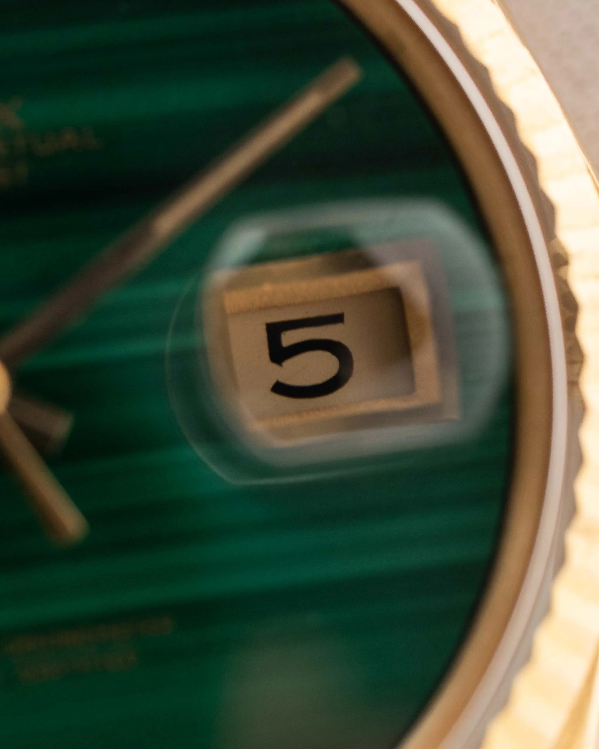 The warm gold fluted bezel and matching gold hands create a refined contrast against the vivid malachite. It’s paired with same year correct Jubilee bracelet it´s a match that rarely can be found.
