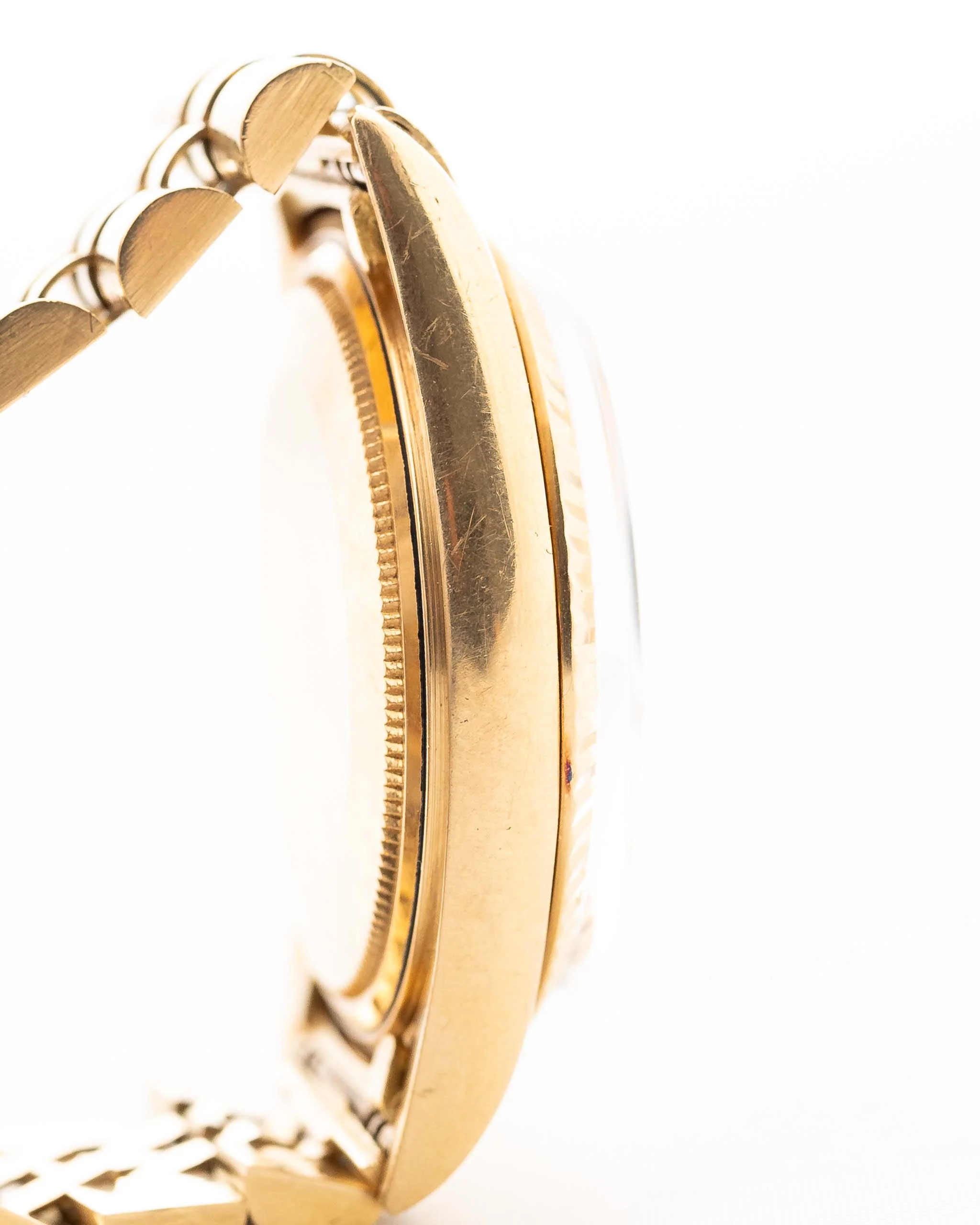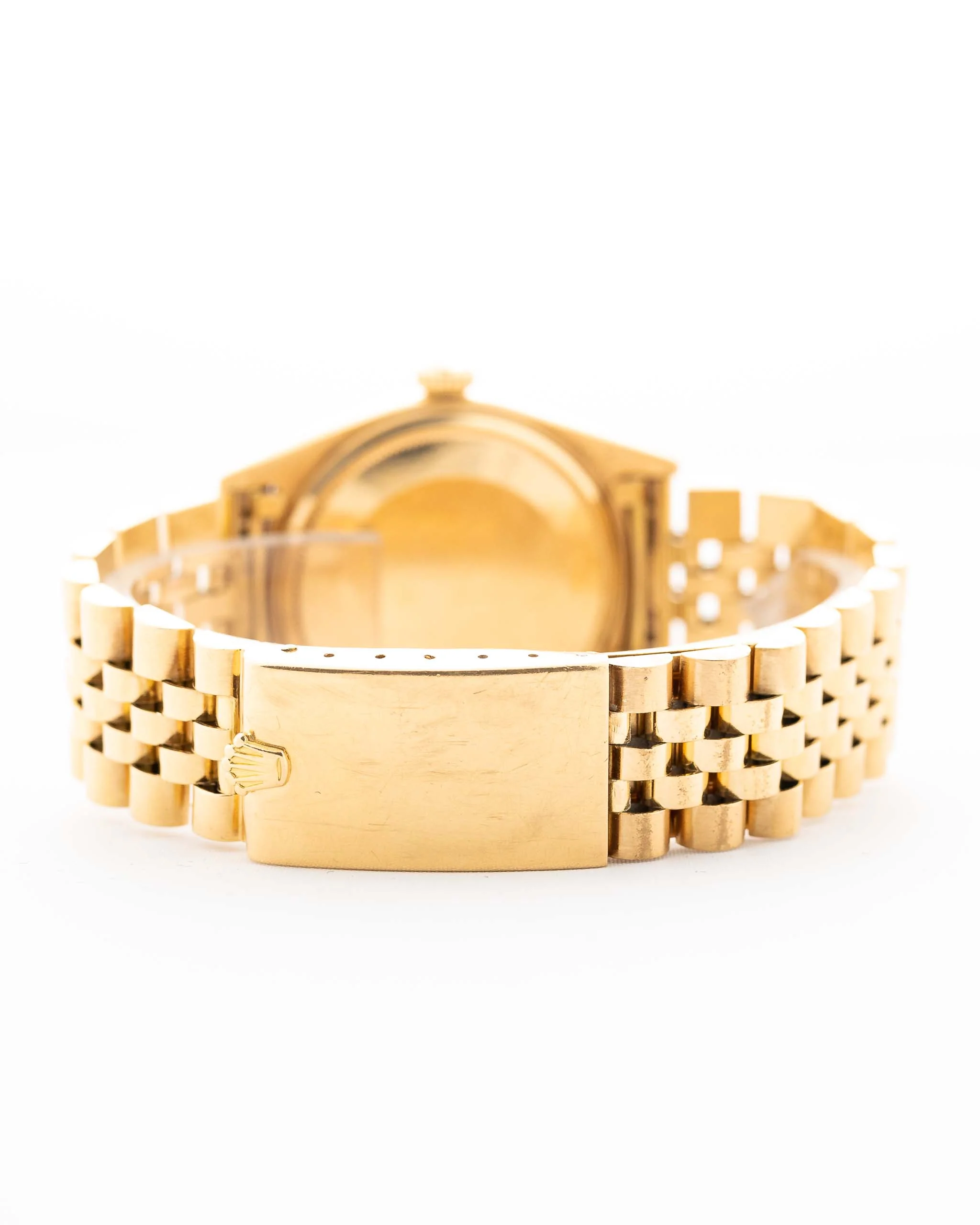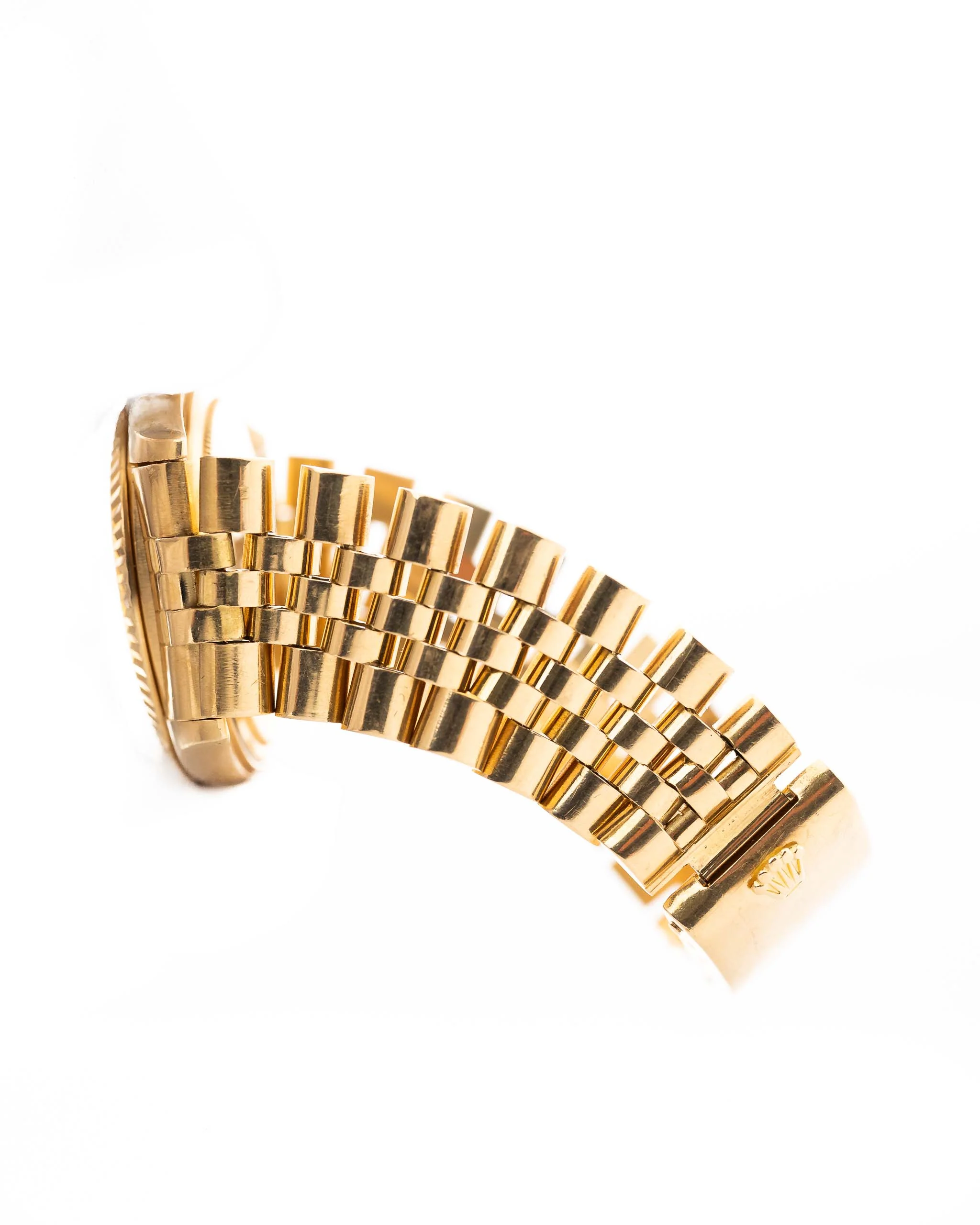 The warm gold fluted bezel and matching gold hands create a refined contrast against the vivid malachite. It’s paired with same year correct Jubilee bracelet it´s a match that rarely can be found.