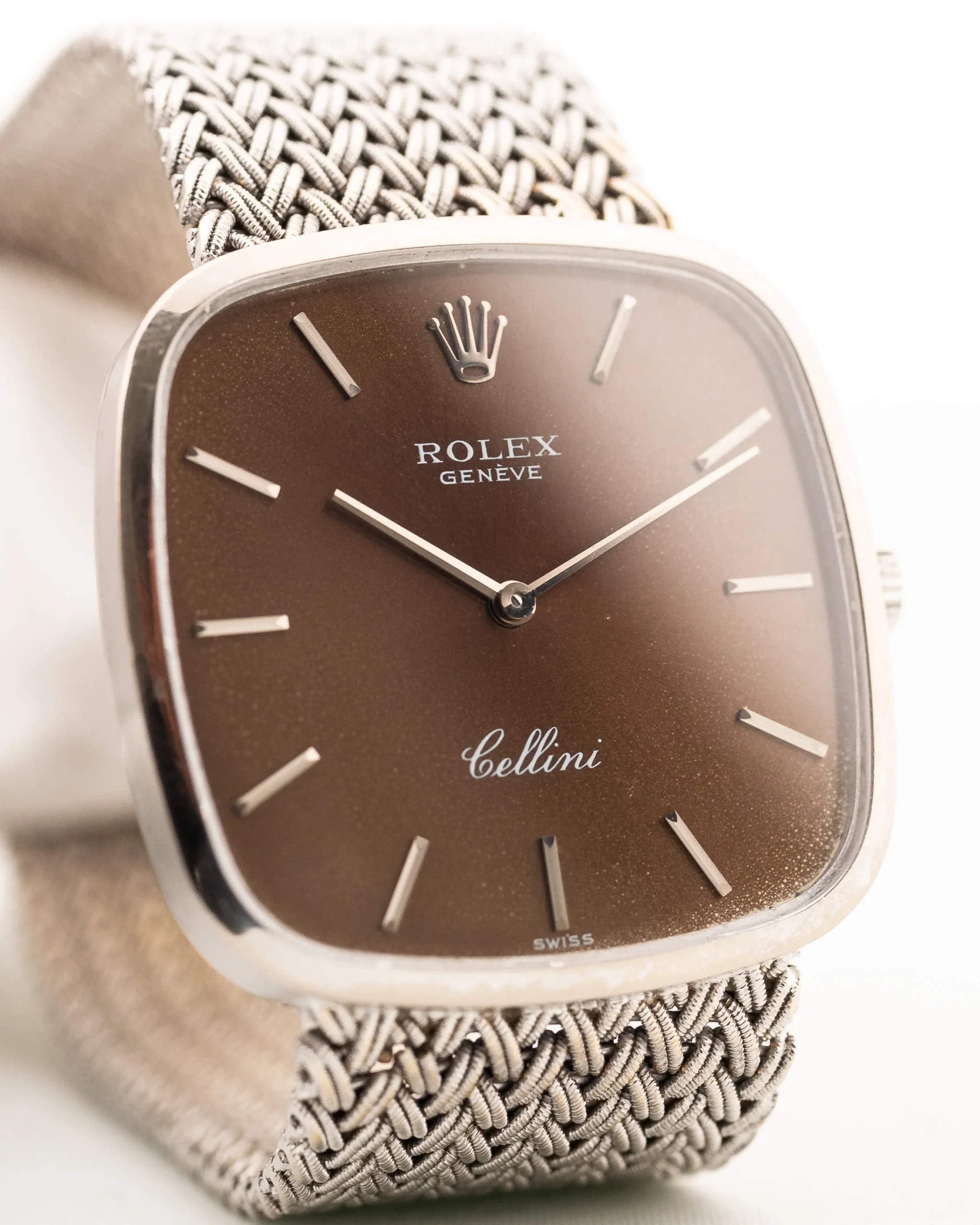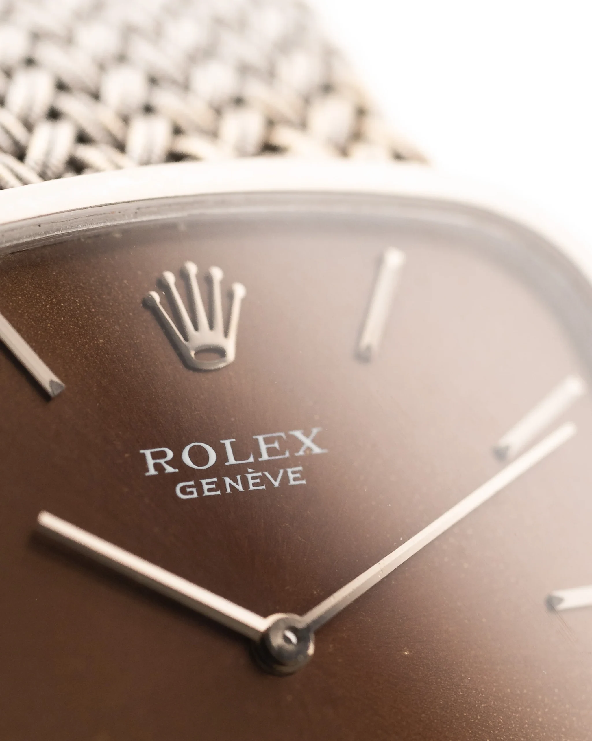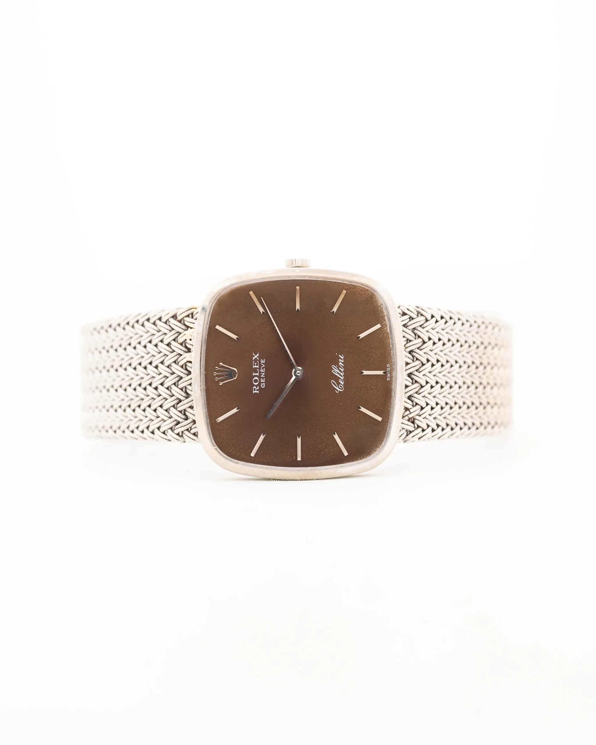 The Rolex Cellini line showcases the dressier side of Rolex compared to its more well-known sport models. This version is fitted in a 18k white gold square-shaped case with a beautiful aged brown dial.