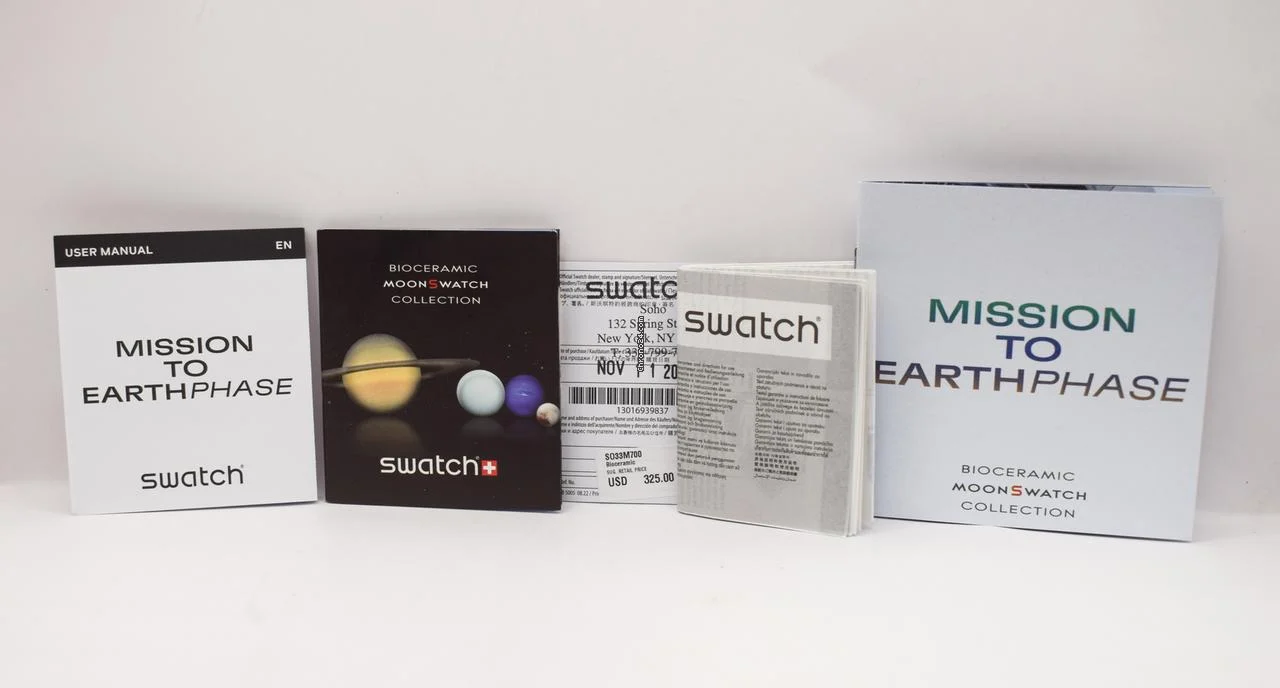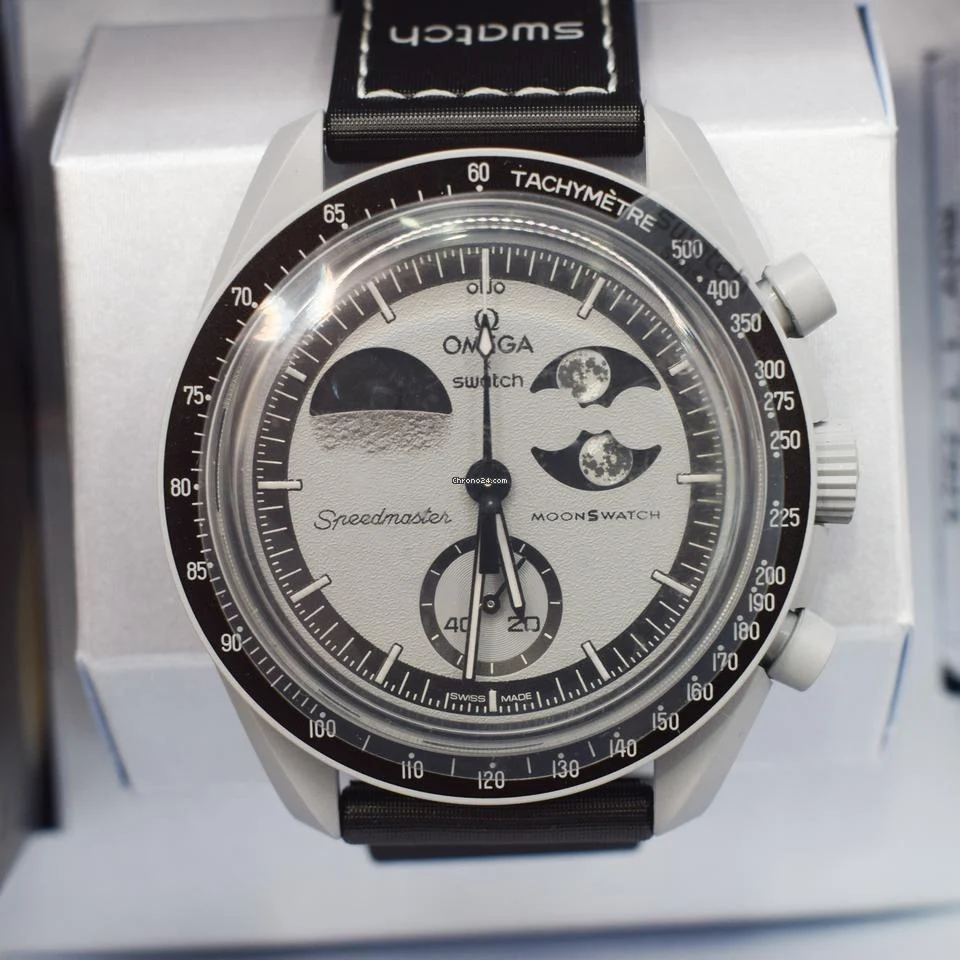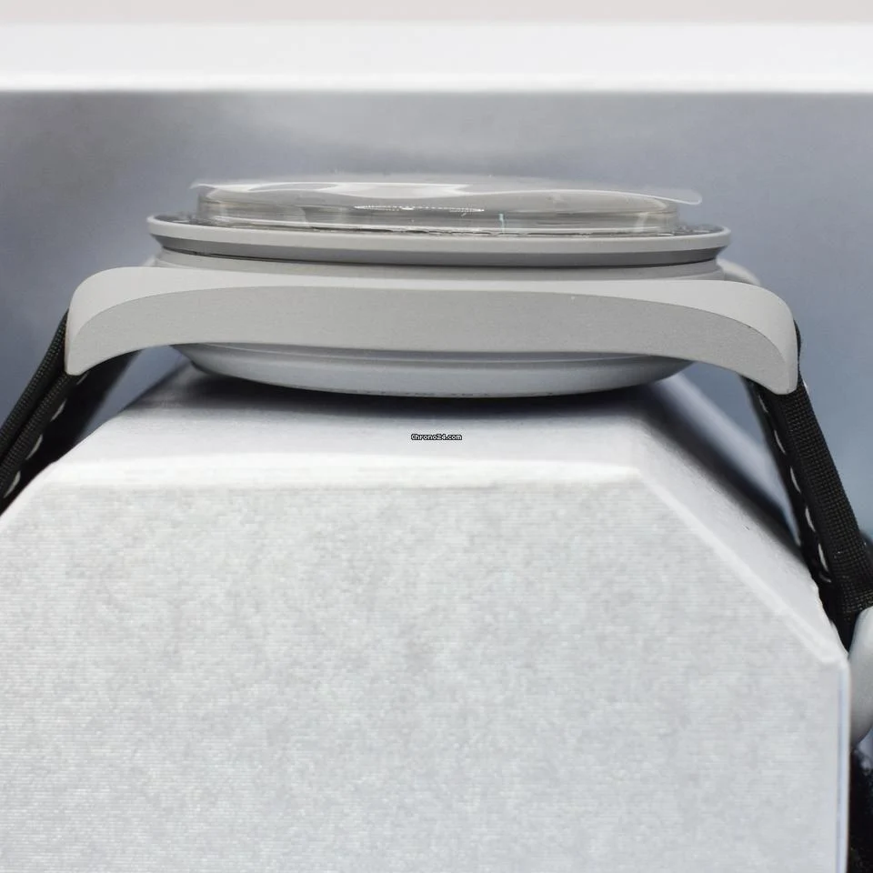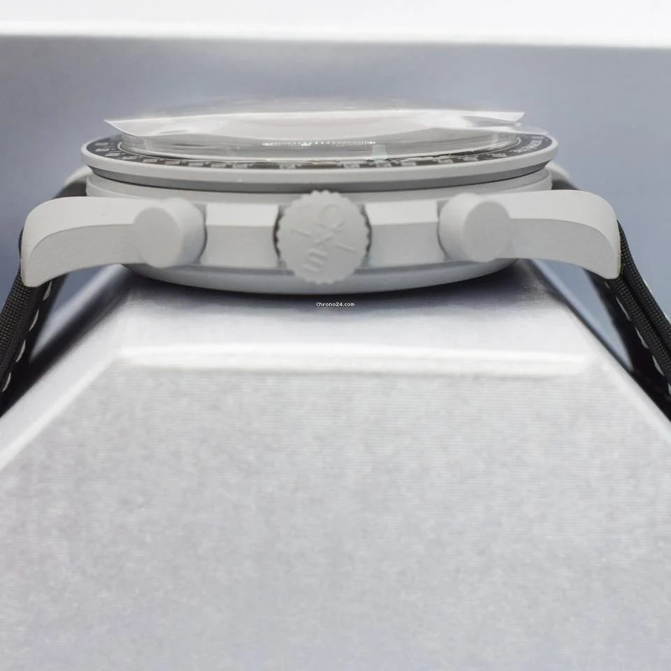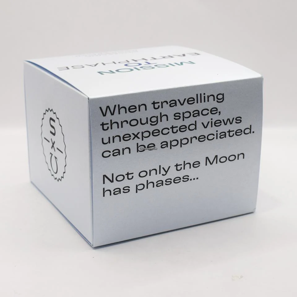 This non-limited chronograph features a light gray Bioceramic case, crown and pushers as well as a black VELCRO strap with contrasting light gray topstitching and Bioceramic loop. It has a gray dial with a grainy texture that resembles the lunar surface. This timepiece has a tachymeter scale in a sleek black hue with markers in a newly created light gray color. In celebration of the Moon and the Earth, it boasts both a moon phase and a patented earth phase function. Two oversized moons with Super-LumiNova (white emission) can be seen on the moon phase disc, which rotates in the subdial set at 2 o’clock. The earth phase function located in the subdial at 10 o’clock is colored. Adding an otherworldly touch, the oceans are coated with UV ink, that emit a blue glow under UV light. An image of the Moon can be found on the battery cover complete with the footprint of Neil Armstrong—the first man to set foot there. The dials of every watch in this collection carry the OMEGA X Swatch branding, the iconic Speedmaster logo and the MoonSwatch logo. Also common to all models are the box-shaped biosourced glass construction, the etched “S” in the center of the glass referencing the Swatch logo, the fine and sophisticated circular pattern on the dial outer ring and the recessed subdials, the sharp and smooth lugs construction and of course the unique Bioceramic feel. The hour markers, hour and minute hands and the tip of the chronograph seconds hand are coated with light gray Grade A Super-LumiNova for a perfect glow in the dark (green emission).